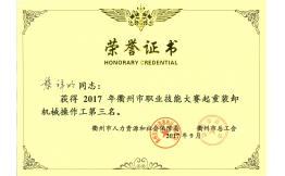 我司員工黎祥明獲得2017年衢州市職業(yè)技能大賽起重裝卸機械操作工第三名
