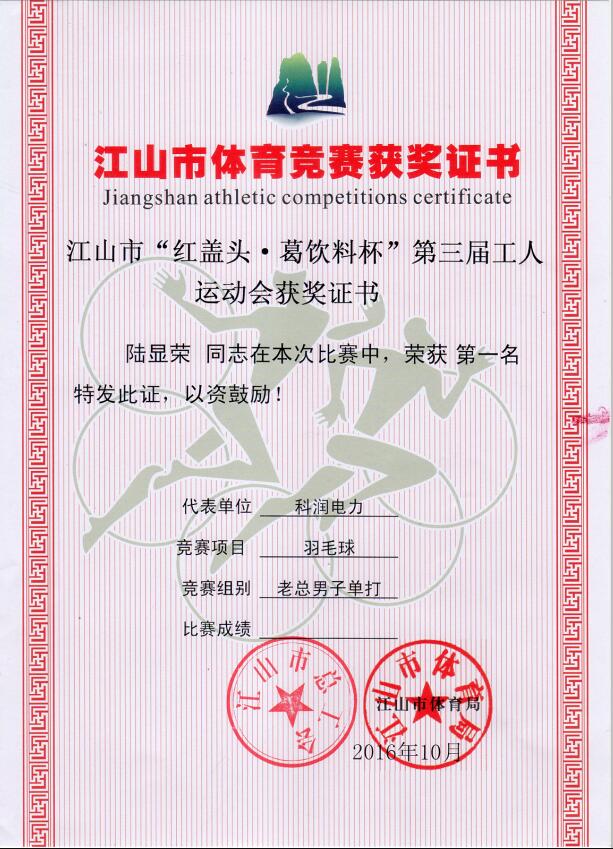 喜訊:生管中心陸總榮獲我市“紅蓋頭·葛飲料杯”第三屆工人運(yùn)動(dòng)會(huì)羽毛球賽老總組男子單打冠軍