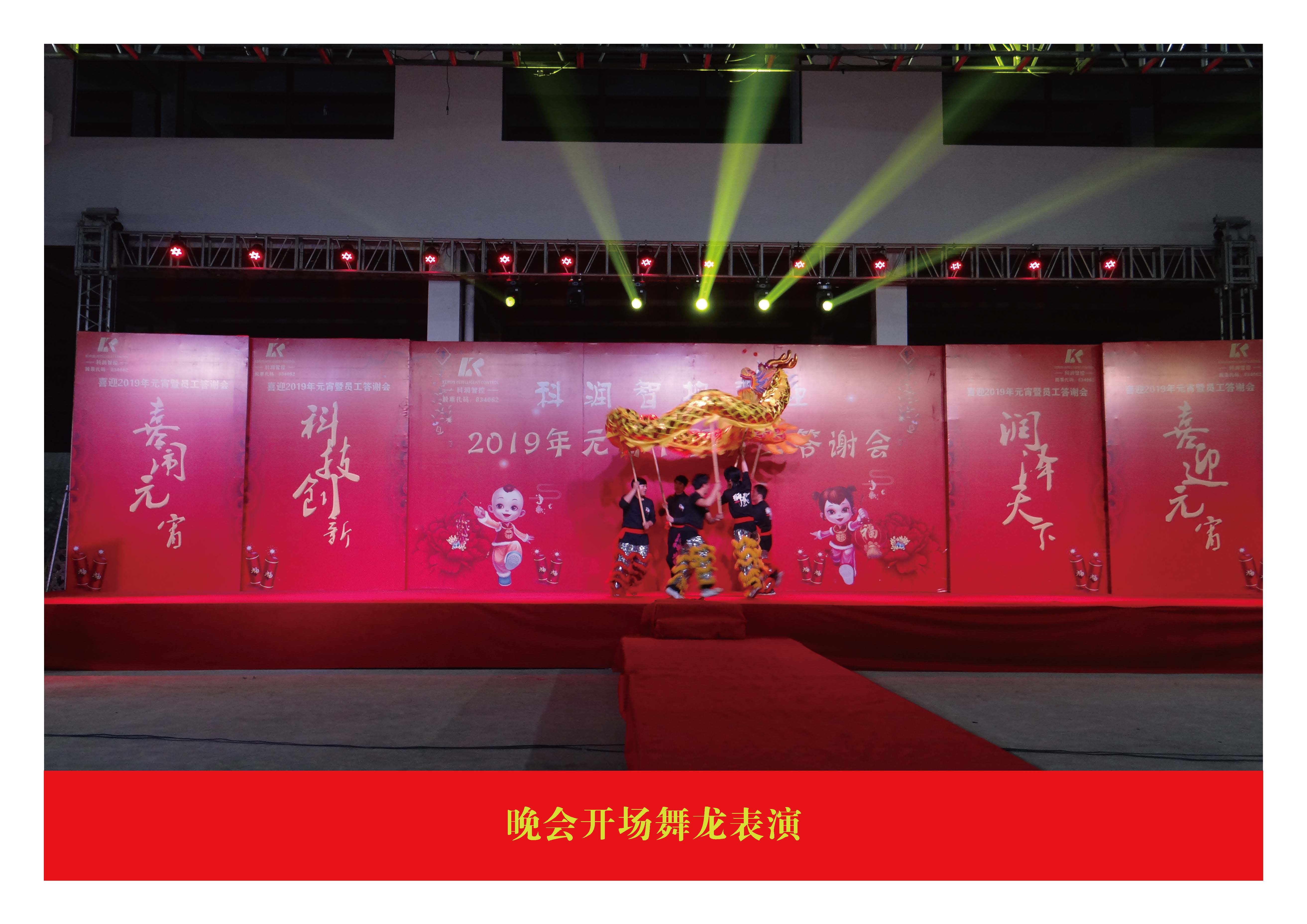 2019年2月17日下午4點30分,全體員工踏著四射的彩色燈光陸陸續續地進入了會場,并于簽到組簽到,接著在工作人員的指引下,按照安排的座位有序地入座。首先,大屏幕上播放了《創新發展》的VCR,回顧了2018年科潤的歷程發展,充分展現了公司的企業文化和文明精神。隨后,在全體員工的熱烈掌聲中,王榮董事長進行了熱情洋溢、信心滿滿的致詞,肯定了公司全體員工在2018年實現5個億產值的業績,也希望在2019年全體員工繼續努力,實現7個億的產值目標,為公司發展引領了方向,明確了目標任務,正式啟動了元宵節晚宴。晚宴開始的同時,抽獎活動穿插著各個精彩的表演也一并開始了。五等獎,四等獎,三等獎,二等獎,一等獎,特等獎的抽獎過程中,開場舞龍,結尾舞獅,中間穿插的科潤員工及其親戚子女精彩紛呈的才藝表演:歌唱,笛子演奏,小提琴演奏,為元宵節晚會帶來了高潮迭起的活躍氣氛。一開場,映入眼前的是一條金色的長龍,舞龍表演者在舞臺上快速地奔跑,敏捷地穿梭,每個動作都是那樣細致入微,淋漓盡致,他們的手臂急促地揮舞著,有力地揮舞著,大起大落的揮舞著。整齊一致的步伐踏出自信飛揚的一面。舞龍表演充分帶動了全體員工的高漲情緒,同時也彰示著科潤員工及其親戚子女即將一一為我們帶來意想不到的精彩表演。表演過程中,表演者偶爾為大家投擲精致的大小不一的小玩偶,也是現場一道亮麗的風景線。尤其,現在的小朋友們,真是兩眼放光的狀態,著實逗樂了一眾旁人。吳枵熠的童聲歌唱,董炫辰的笛子演奏,周曉玲的《新貴妃醉酒》,銷售經理嚴小榮的《像夢一樣自由》,總經理章群峰的《步步高》,董事長王榮的《千紙鶴》,都為我們展示了不一樣自我與風采。最后,在舞獅歡喜鬧元宵及美好的祝福下,王榮董事長為晚會結束獻上了最后的發言,提早祝福全體員工元宵節快樂,希望公司能夠未來宏圖大展,步步高升!