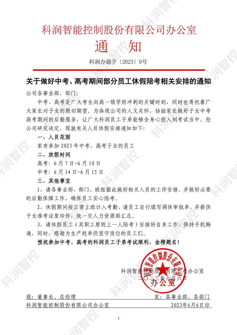 一年一度的中考、高考是檢驗莘莘學子學習成果的關鍵一戰,是各位考生向高一級學府沖刺的關鍵時刻,同時也寄托了家長們對子女的殷切期望。在中考、高考時刻,家長們是多么希望能安心陪伴著孩子,在考場外等待著孩子。科潤智控真心關愛員工,彰顯人文關懷,出臺了中考、高考期間員工帶薪休假陪考的通知,協助家長做好后勤服務。